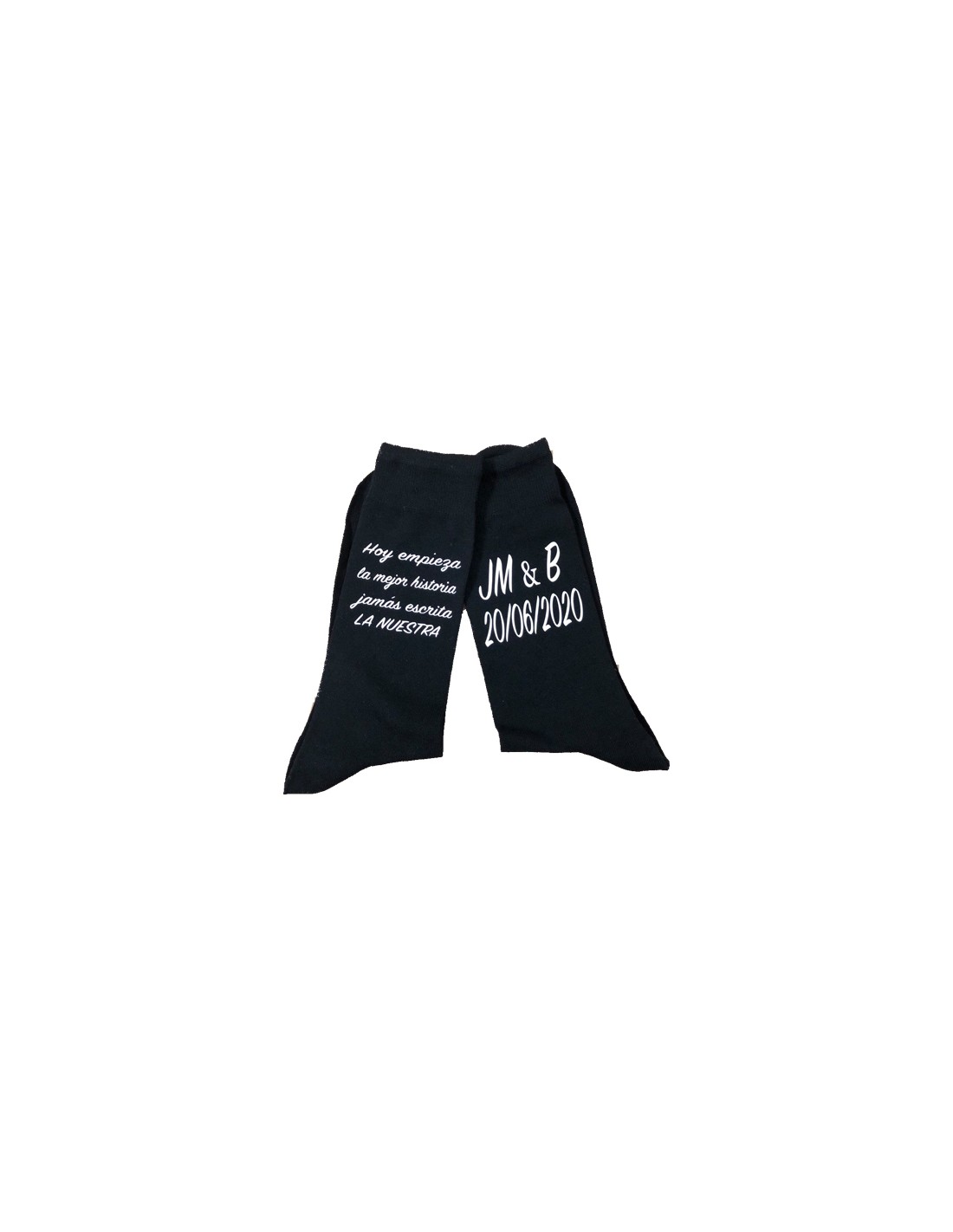No olvide guardar su personalización para poder añadirla al carritoCalcetín personalizado con texto Hoy empieza la mejor historia jamás escrita La Nuestra y Iniciales de la pareja y fecha del evento personalizadas. Confeccionado con hilo de bambú gracias al cual obtenemos una agradable sensación de frescura.