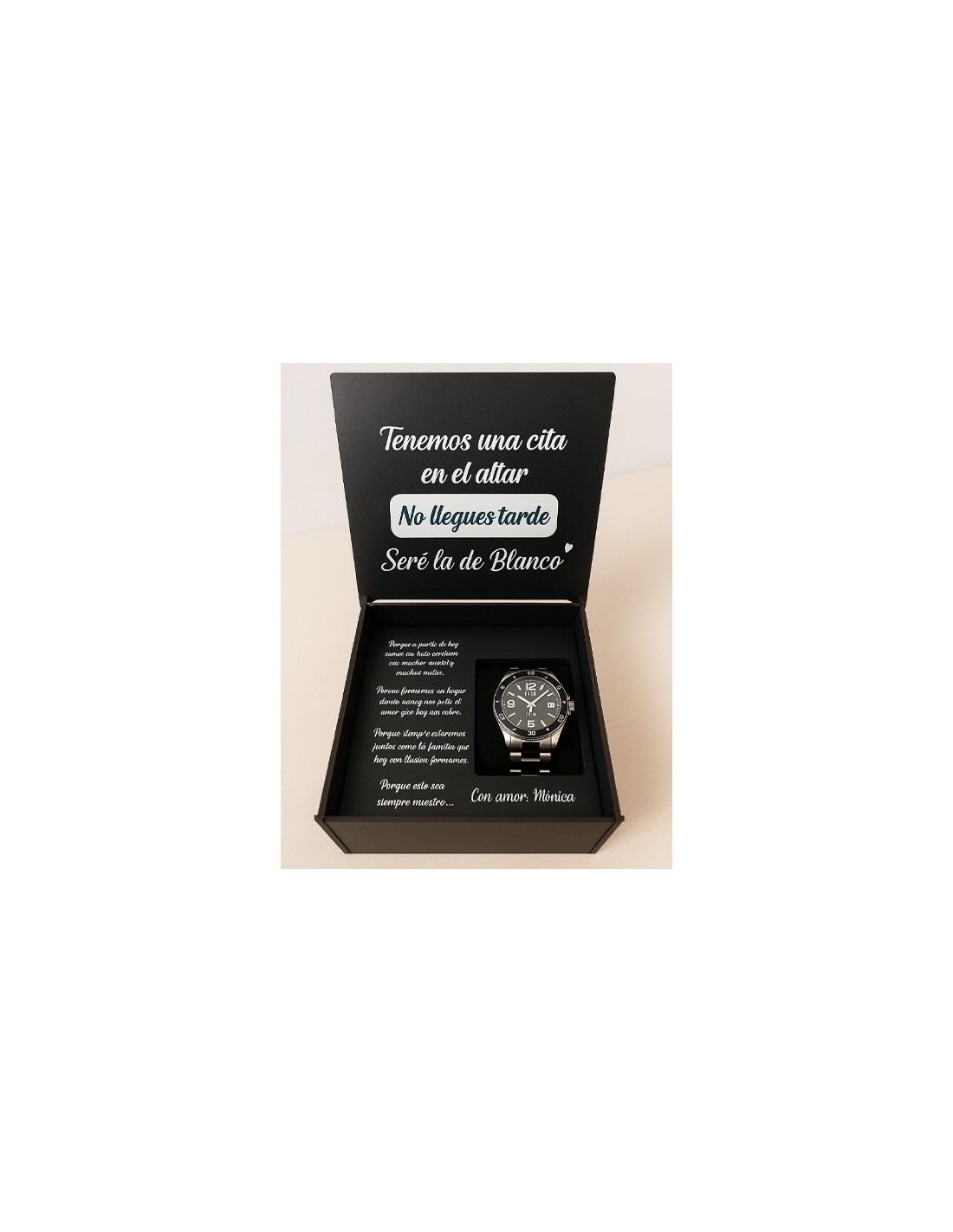 No olvide guardar su personalización para poder añadirla al carritoHaz que el momento de regalar el reloj al novio sea todavía más especial con esta caja personalizada para reloj, diseñada para transmitir emoción y recordar la importancia del gran día.