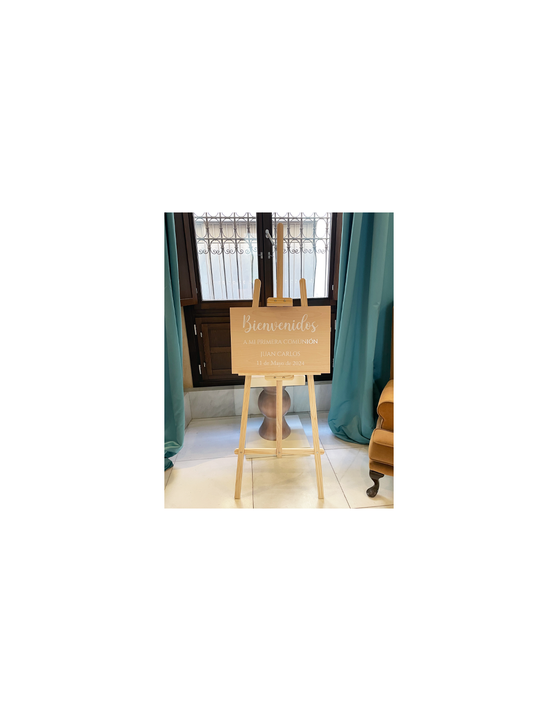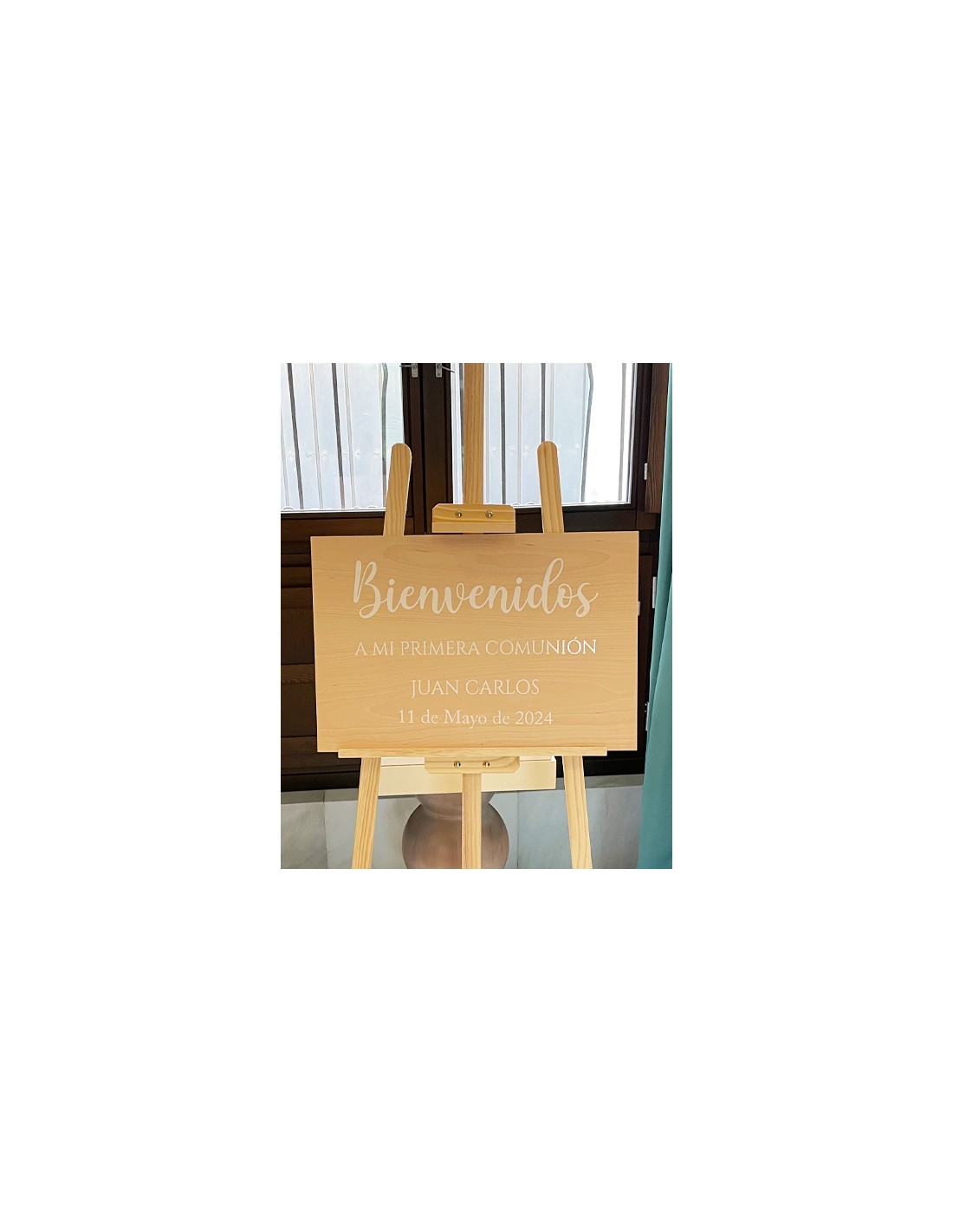 Dale la bienvenida a tus invitados con este elegante cartel de madera de haya, perfecto para bodas, comuniones, bautizos o cualquier tipo de celebración especial. Personalizado con el texto del evento en vinilo, disponible en blanco o negro según tu preferencia, este cartel es ideal para colocarse sobre un caballete y añadir un toque cálido y sofisticado a la decoración. Su diseño natural y personalizable lo convierte en un recuerdo inolvidable que destacará en cualquier escenario.
