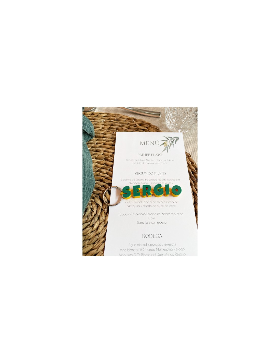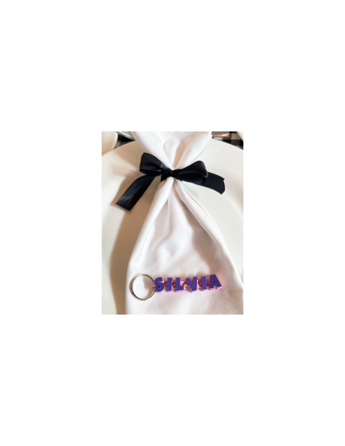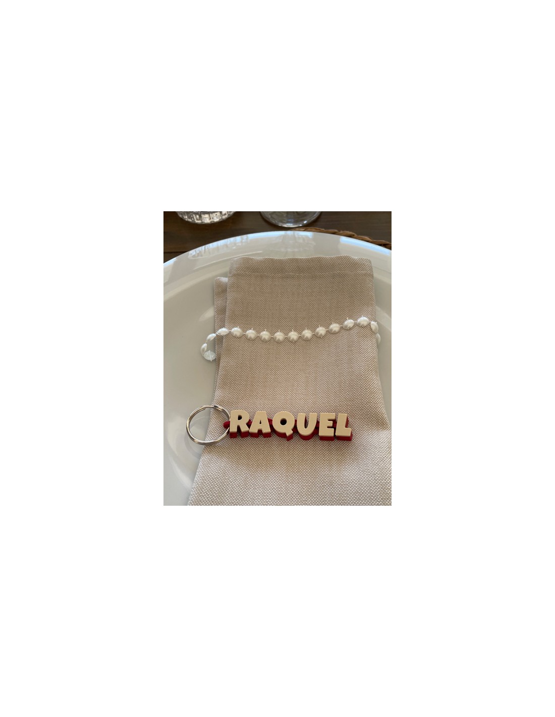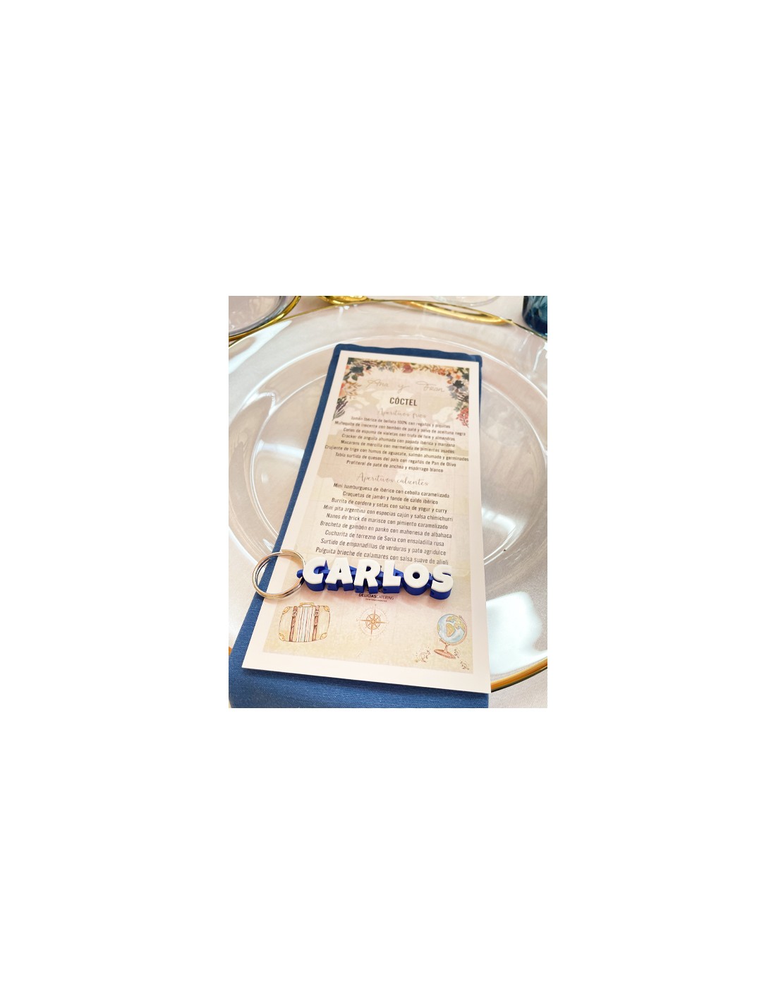 No olvide guardar su personalización para poder añadirla al carritoDescubre nuestros exclusivos llaveros personalizados en impresión 3D, diseñados con el nombre de cada invitado para crear un detalle único y muy especial. Son perfectos para utilizar como marcasitio en bodas, comuniones, bautizos y eventos, aportando un toque original que los invitados podrán conservar y usar en su día a día.