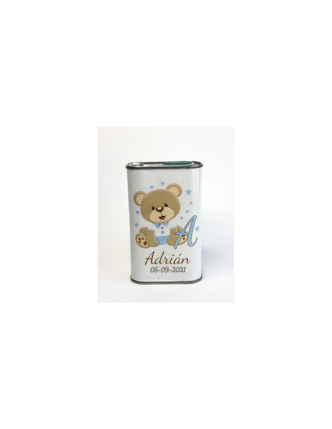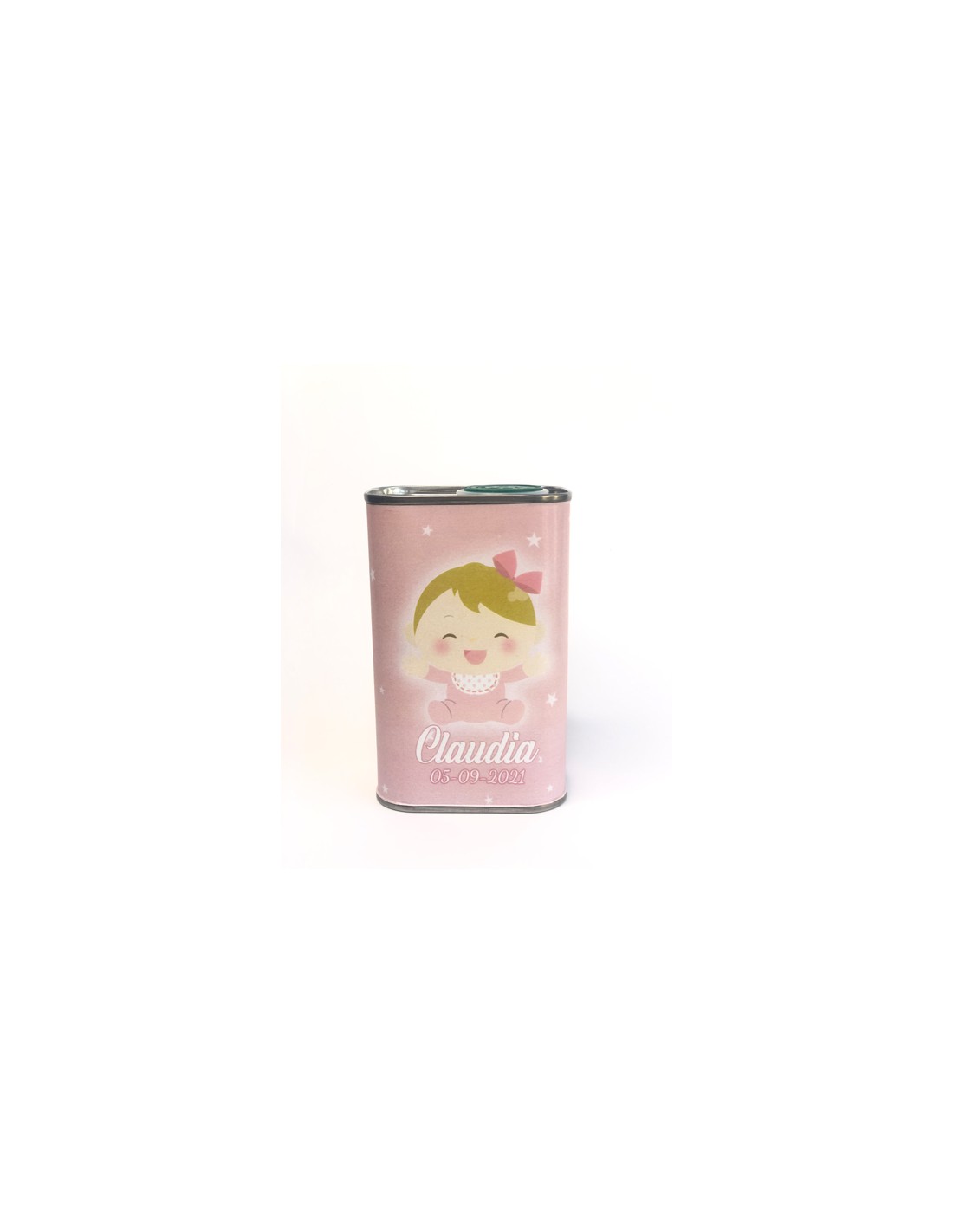 Lata de Aceite de Oliva Virgen Extra personalizado con los datos y temática de tu evento. Ideal para regalar en boda, bautizo, comunión o cualquier tipo de evento corporativo.