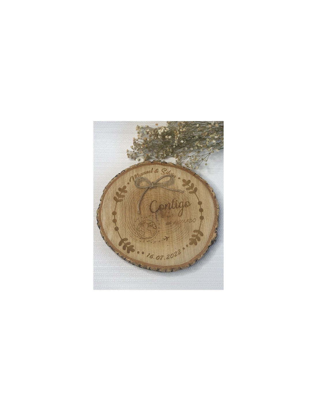 Porta alianzas en rodaja de madera de fresno natural sin tratar, grabada a láser con el diseño que más te guste. Dar el Si Quiero con este porta alianzas natural y bonito como la madera es tendencia.