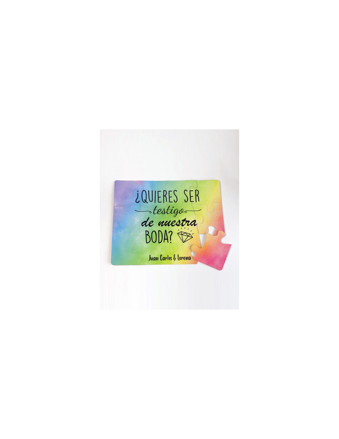 No olvide guardar su personalización para poder añadirla al carritoPídele a tus amigos que sean testigo de tu boda de una forma original. Con un puzzle personalizado con el texto que quieras poner.